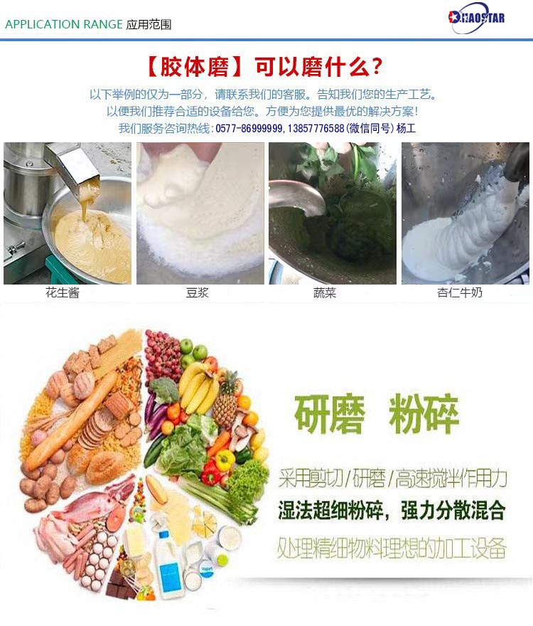 可代替并優(yōu)于石磨,砂磨機(jī)、球磨機(jī)、乳勻機(jī)、乳化機(jī)、三輥機(jī)、搗碎機(jī)等工作。亦可按照客戶對加工物料不同的酸度、堿度、濃稠度等性質(zhì)特殊要求定制生產(chǎn)。